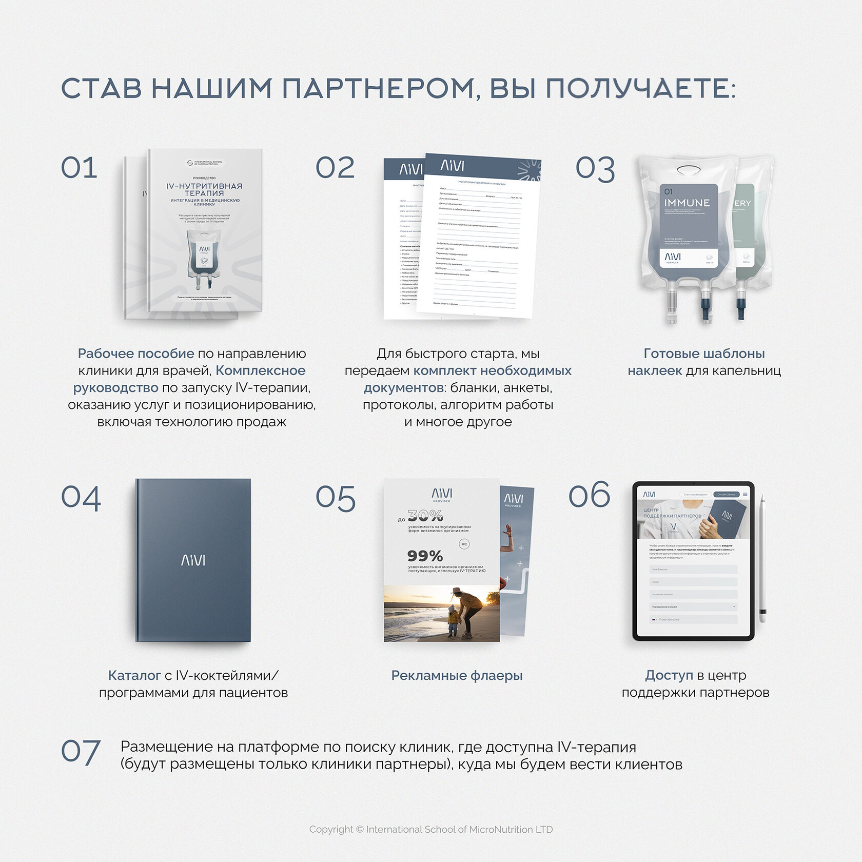 AIVI — сертифицированный провайдер IV (внутривенной)-терапии. Это платформа, на которой можно пройти тестирование и выбрать регион, город, клинику, программу в учреждениях разного направления: клиники косметологии, санатории, фитнес-центры, клиники пластической хирургии, клиники превентивной медицины, реабилитационные центры.